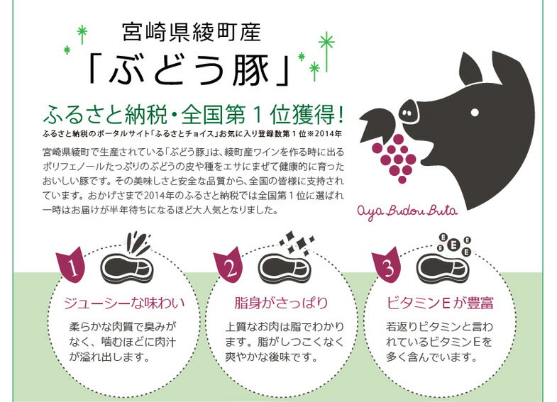 返礼品説明 名称 綾ぶどう豚 ふだん使いセット 2kg 産地 宮崎県 内容量 綾ぶどう豚切り落とし500g×2パック 綾ぶどう豚ももスライス500g×2パック 消費期限 別途商品ラベルに記載(冷凍保存で約90日) 保存方法 要冷凍(-18℃以下) 加工業者 有限会社 新垣ミート(宮崎県宮崎市大字糸原1963-28/TEL:050-3775-2922) 包装 トレイ ・ふるさと納税よくある質問はこちら ・寄附申込みのキャンセル、返礼品の変更・返品はできません。
